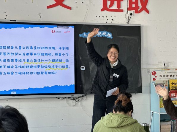 作为本年度教师区域培训的最后一场,项目组特别邀请探客资深教师,河南商丘市示范区贾寨镇张林小学的刘秋梅老师面向全体老师开展《一起来做跷跷板》一课。课堂上秋梅老师语调轻柔,在推进课堂流程的过程中注重与学生的互动,通过提问捕捉学生的思考并鼓励学生大胆尝试。秋梅老师的课堂组织有序,让参训教师以“学生”身份沉浸体验,直观感受到要上好一节探客课程暗含如此多细节,收获可迁移的示范经验。