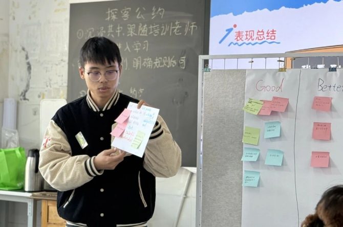 教学相长的意义在复盘环节中更能显现。探客教育课程研发李文佳老师与现场教师围绕刘秋梅老师的课堂流程,结合探客工具“Good-Better”展开复盘反思。张双峰老师点赞秋梅老师在组织班级动手实践时的有序性;杨帆老师则注意到,秋梅老师在实践过程中持续巡堂,基本能关注到每位参与者,及时给予鼓励提醒,课堂氛围轻松。此外,杨帆与孙永盛老师都提到,在课堂上预留作品展示时间,可以有效提升学生的荣誉感。