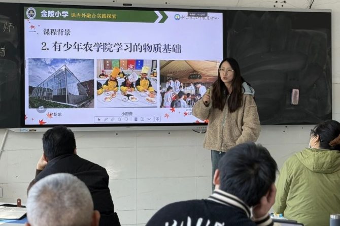 培训还邀请南京金陵小学的杨帆老师分享《石抱树少年农学院》校本课程研发经验。她立足学校少年农学院资源——大丛林、花果山、农耕园等本土场景,从语文、数学、科学、美术、劳动等多学科视角挖掘课程资源,开展跨学科教学实践。高老师及助教杨老师的分享引发参训教师强烈共鸣,为科学教育教学工作注入新思路。