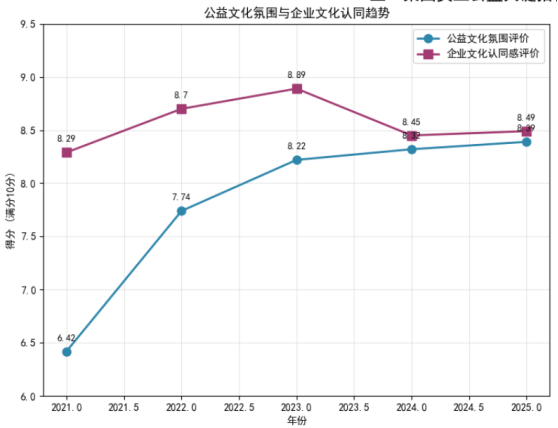 国内公益文化氛围评分连续五年增长,2025年达到8.39分(满分10分)。然而,企业文化认同感得分却停留在8.49分,增长几乎停滞,甚至略低于前两年的峰值。边际效应递减,增长进入瓶颈期。