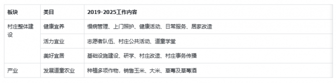 在这一阶段的发展过程中,业务结构也经历了一些调整和变化。一般来说,乡村振兴比较常见的模式是针对某个特定议题发力,例如村庄经济、医疗健康等,但道童村是整村工作,因此涉及许多方面。早期规划时,业务内容被分为了“医疗养老”、“三一学校”、“村容村貌”、“村民参与”、“产业发展”及“文化艺术”几个板块。其中优先发展前四个板块,待成熟后再开展后两个板块。但后来,依据实际情况,村里工作分为了两个部分:村庄整体建设和农业产业。后者单独注册了农业公司运营,前者又根据国家政策文件,细化为“健康宜养”、“活力宜业”和“美丽宜居”三个类目。这些共同组成了道童乡村振兴的愿景。
